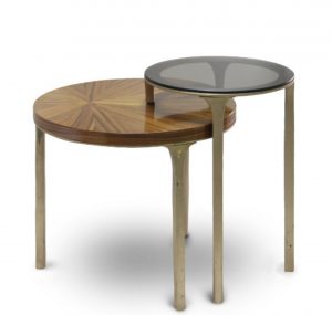This beautiful booster table from Brabbu Design Forces. The combination of gray smoked glass and palisander wood veneer makes this delicate brass side table a unique piece.