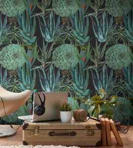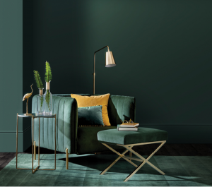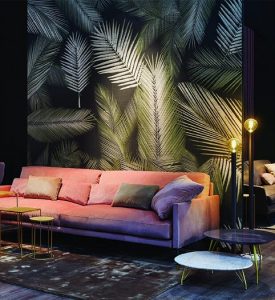Rich and deep jewel tones, sapphire blue and emerald green. Velvet is omnipresent and combines beautifully with the richness of brass…. The theme Botanica is everywhere.