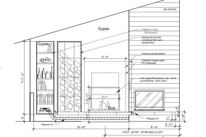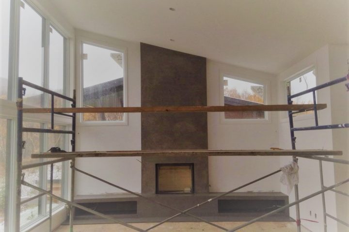 Central element of this new construction, the staircase here is a perfect continuity of the design of the house (see above 3D, plan and fireplace in construction).